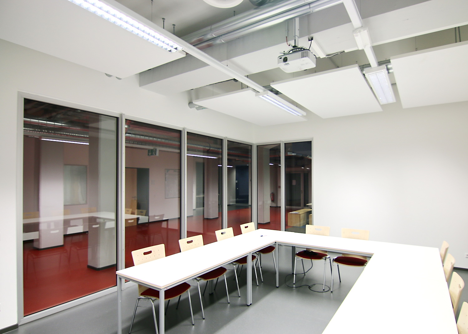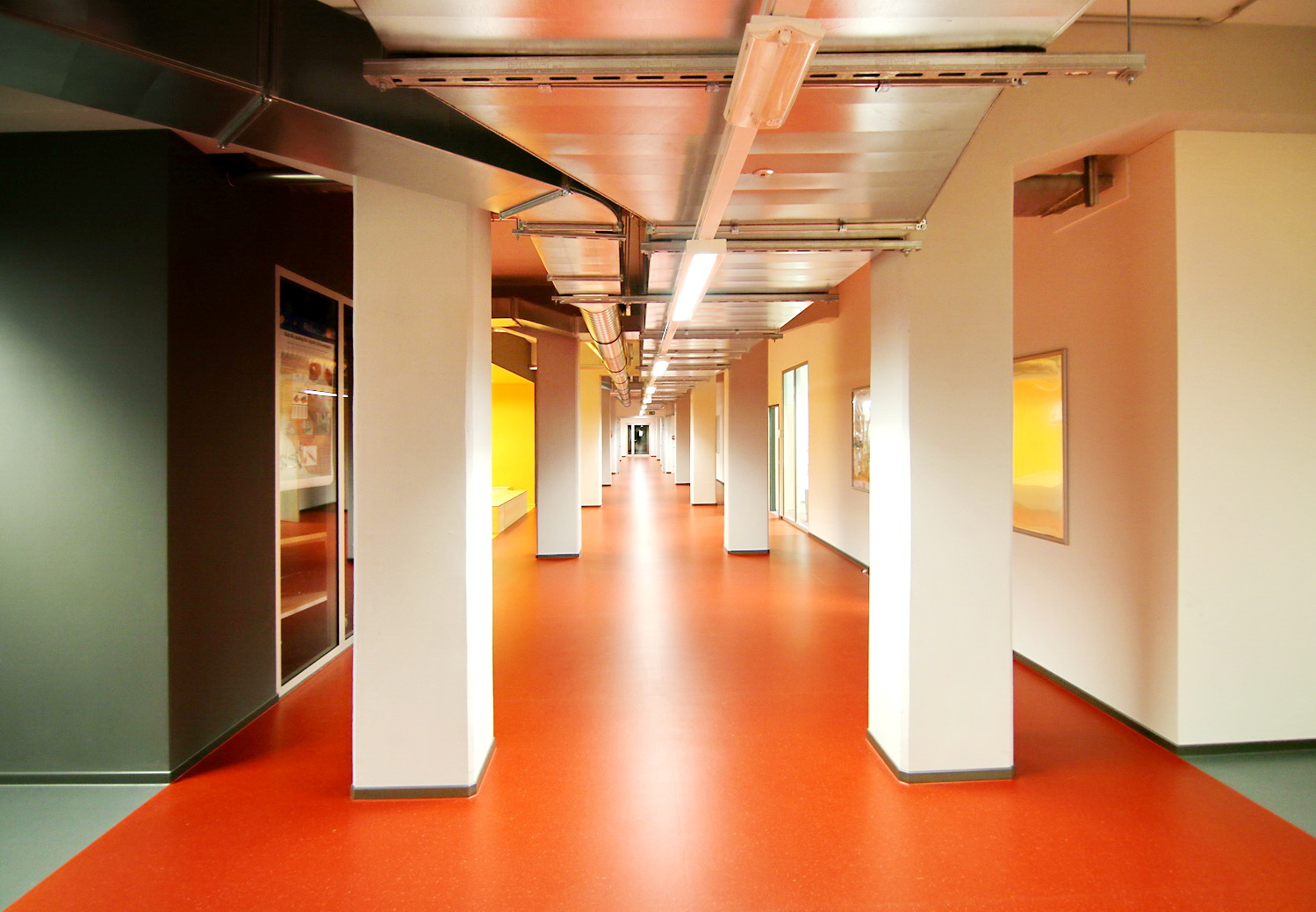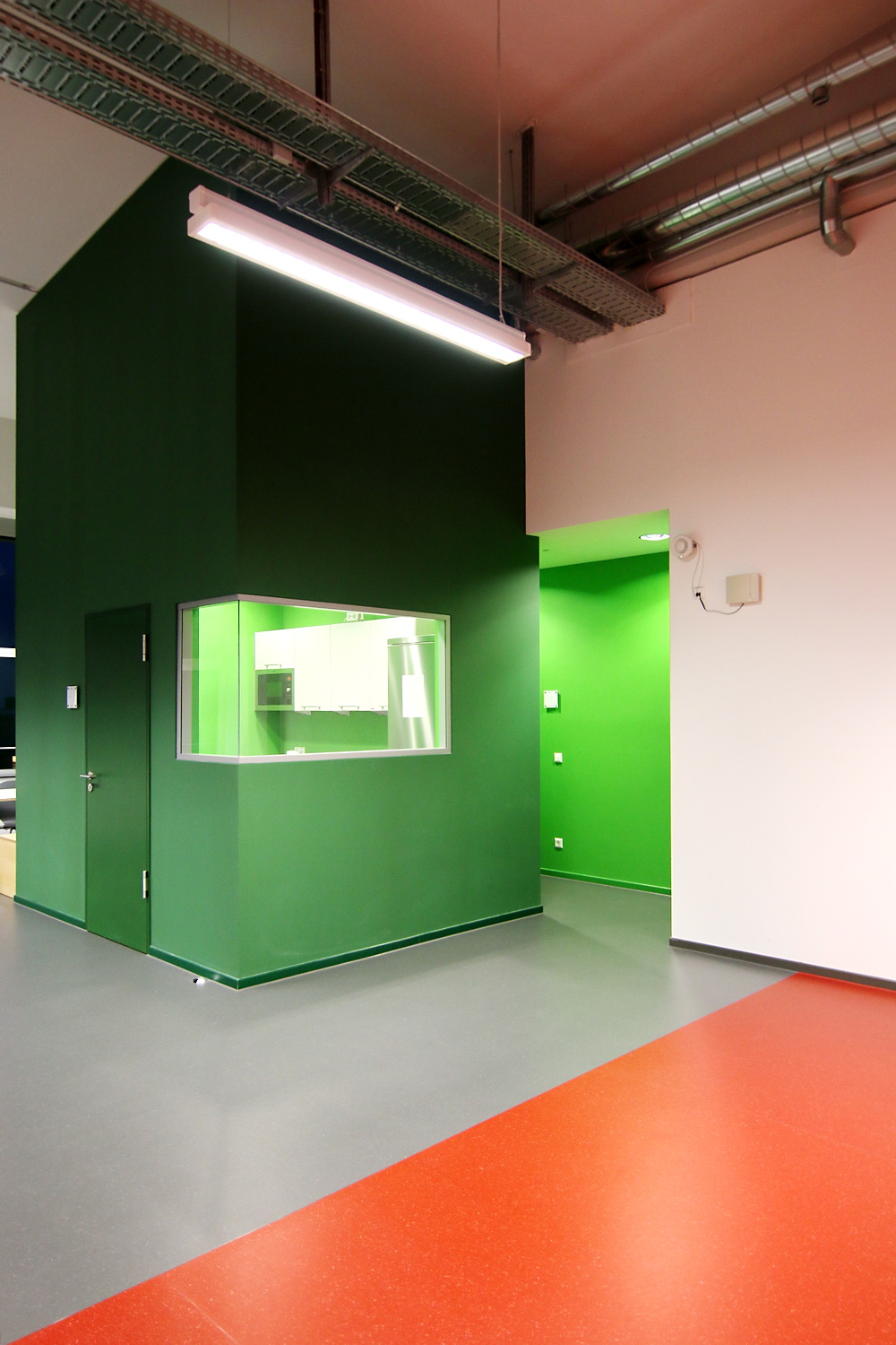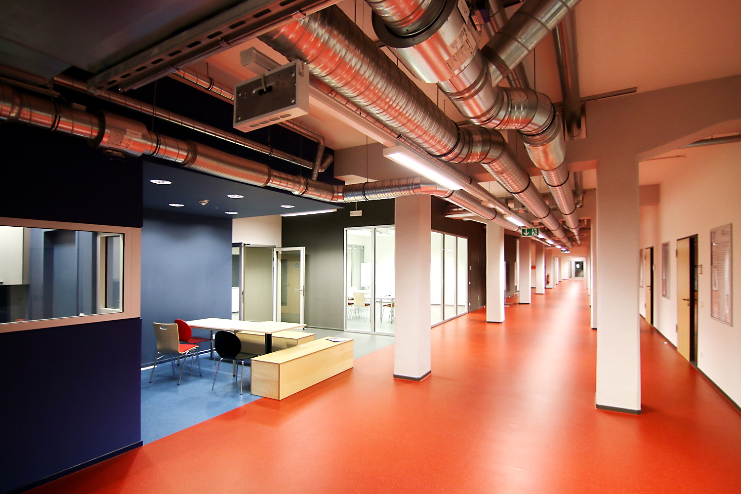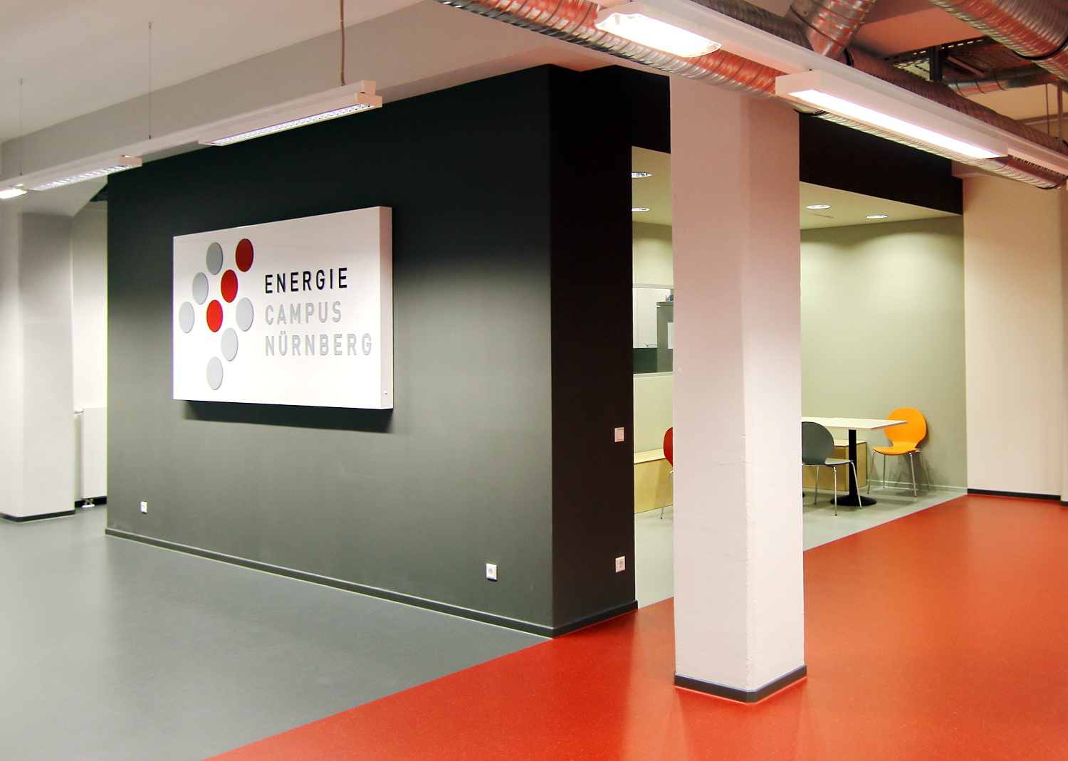In den Obergeschossen 1 bis 4 sind weitere Labor- und Werkstatträume untergebracht, die den Büroflächen der verschiedenen Institutionen angegliedert sind. Diese sind in Abhängigkeit ihrer Ausrichtung in Projektgruppen zusammengefasst und im Gebäude platziert, wodurch eine übergreifende Zusammenarbeit ermöglicht bzw. gefördert wird. Aus den unterschiedlichen Ausrichtungen der Projektinhalte ergaben sich auch Anforderungen an die Gestaltung und Materialwahl. Unter Beachtung des gesamtheitlichen Farbkonzeptes wurde beispielsweise beim Bodenbelag durch die Wahl verschiedener Ausführungen wie Beschichtung, Fliesenbelag oder Vinyl- bzw. Linoleumbelag auf die erforderlichen Eigenschaften wie Ableitfähigkeit, Chemikalienbeständigkeit und Hubwageneignung reagiert.