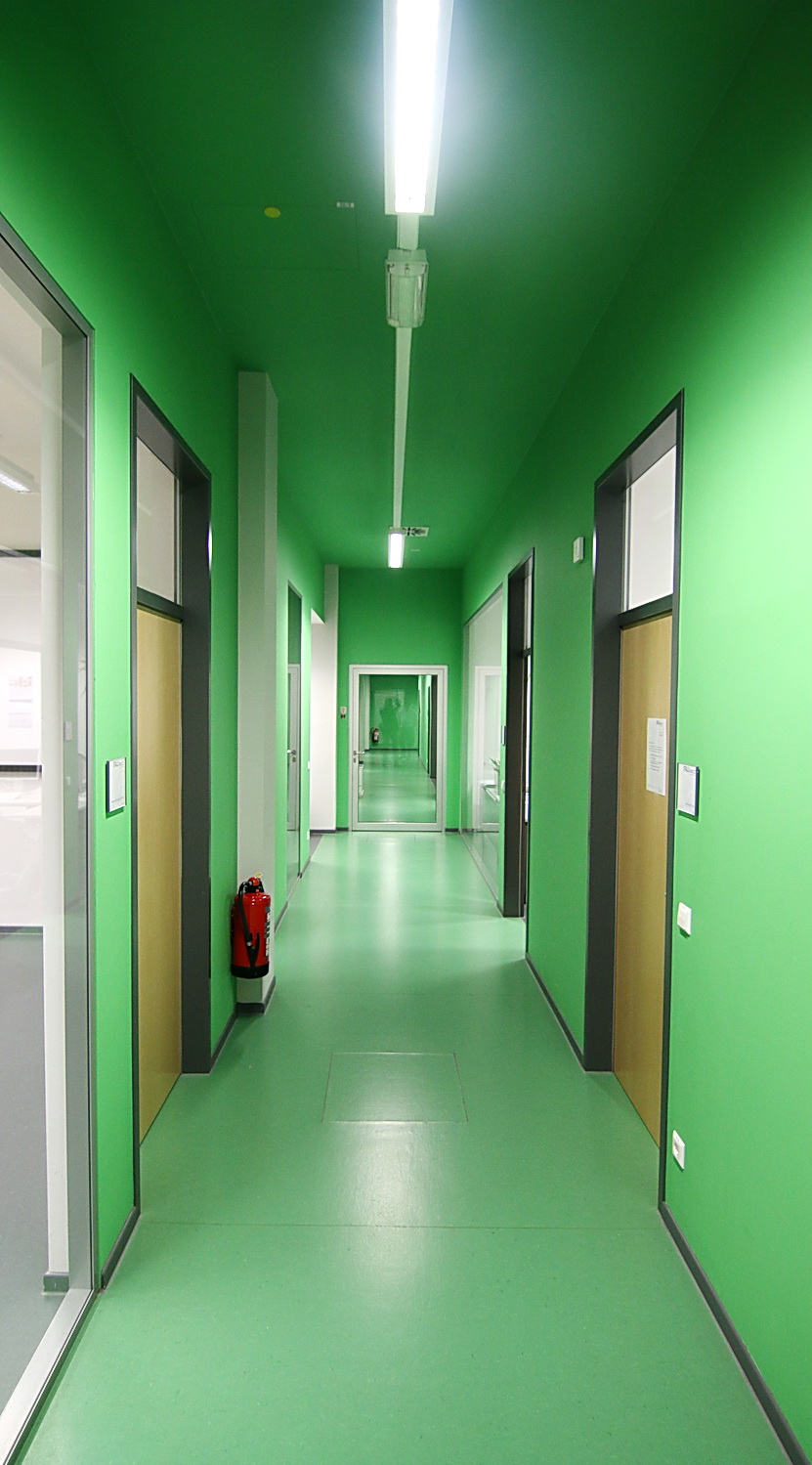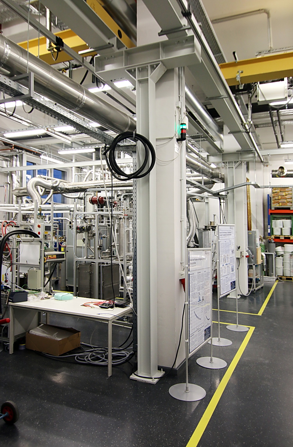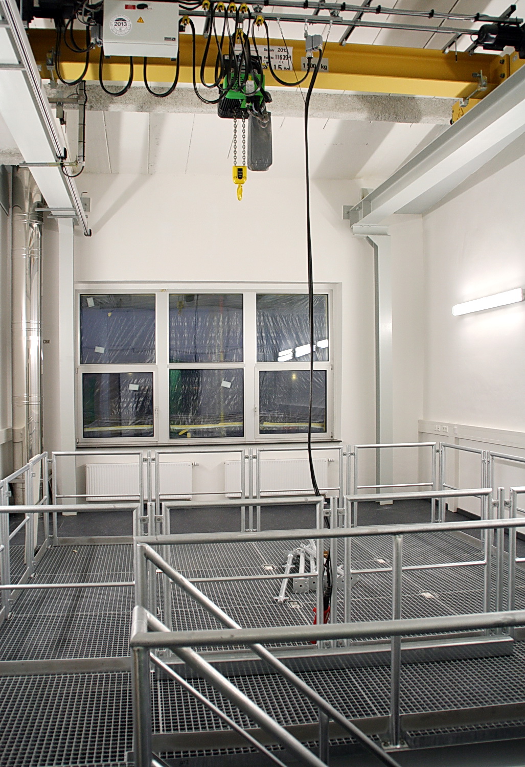 Dies stellt natürlich komplexe Anforderungen an das Raumprogramm. So bestand für uns eine Hauptaufgabe darin, die gewünschten Laborräume unterschiedlicher Art mit den erforderlichen Werkstatträumen, von Schlosserei bis zur Elektrowerkstatt, in denen die Testanlagen teilweise vollständig selbst hergestellt werden, räumlich entsprechend in Verbindung zu bringen. Eine zentrale Rolle spielt hierbei das ca. 350m² große Verbrennungslabor mit Kaminanlagen, in dem die verschiedensten Versuchseinrichtungen platziert werden können. Durch die Errichtung drei neuer Kranbahnen ist die gesamte Fläche auch mit schweren Lasten erreichbar. Für besonders hohe Anlagen wurde ein Deckendurchbruch mit flexibler Abdeckung geschaffen. In diesem Bereich kann zur großen Raumhöhe des Erdgeschosses noch die des 1.Obergeschosses mit genutzt werden.