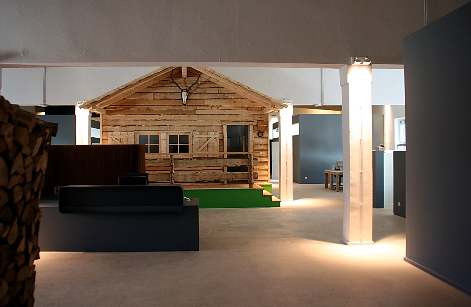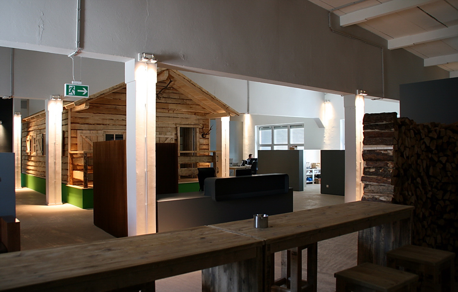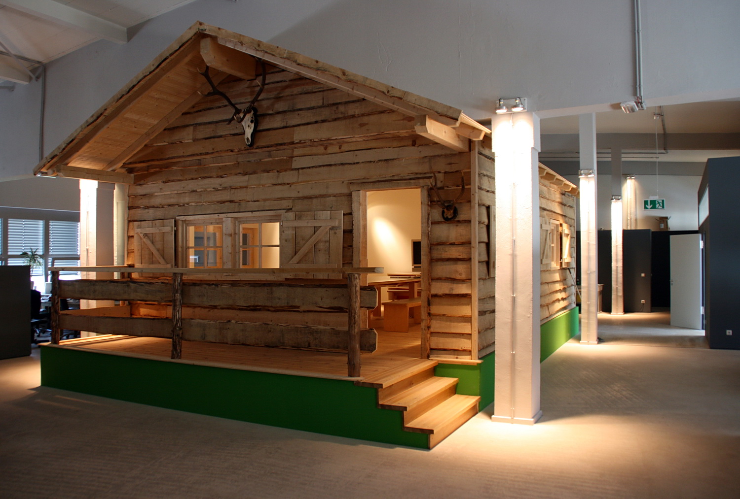 ist kreativer, offener Raum mit brüstungshohen Bürotrennwänden, die den Mitarbeitern ihren eigenen Arbeitsbereich bieten und dennoch interne Kommunikation ermöglichen. Für die Geschäftsleitung sind über die Fläche verteilt Büroräume als Boxen eingestellt, die die notwendige Abgeschlossenheit herstellen, gleichzeitig zur Gesamtgliederung beitragen und ein Wechselspiel aus offenen und geschlossenen Bereichen schaffen. Dominierendes Element und Blickfang ist der zentral platzierte Besprechungsraum, der als komplette, in die Einheit eingestellte Almhütte als Holzkonstruktion mit einer Bekleidung aus Schwartenbrettern ausgebildet wurde. Bei Bedarf kann hier sogar auf deren Terrasse verweilt werden.